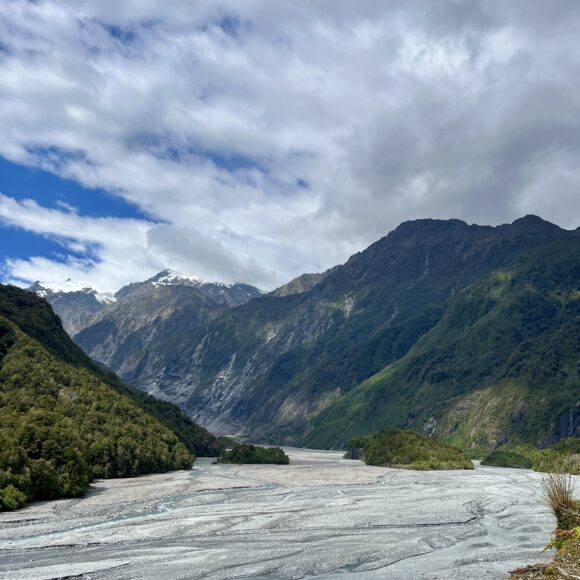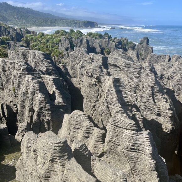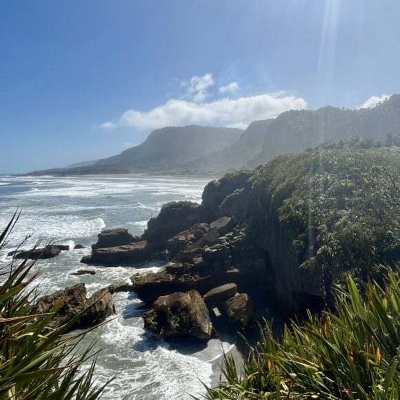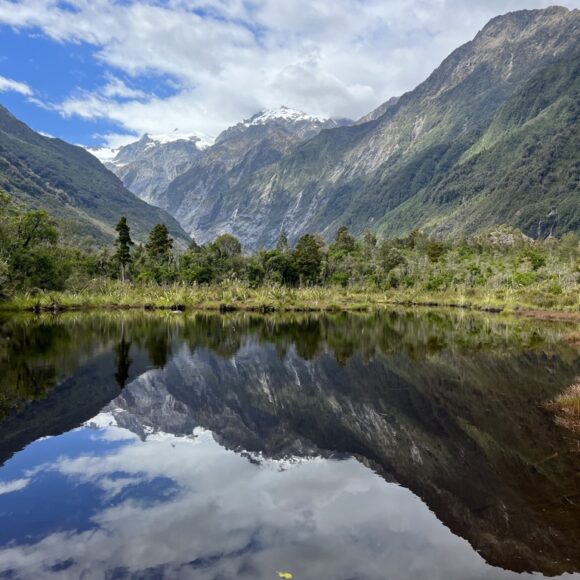 Today, you will arrive in Franz Josef. Stop at Paparoa National Park along the way to see limestone canyons and the pancake rocks. That evening, if you want to get some movement in after a long day of driving, do Okitaro Trig for a fairly easy hike with great views at the top. The next day you can tackle a bigger hike if you like, I did Robert’s Point Track, but another popular one is Alex Knob. Alternatively, you can book a helicopter ride and glacier walk if interested. On your way out the next morning take an easy walk around Lake Matheson.